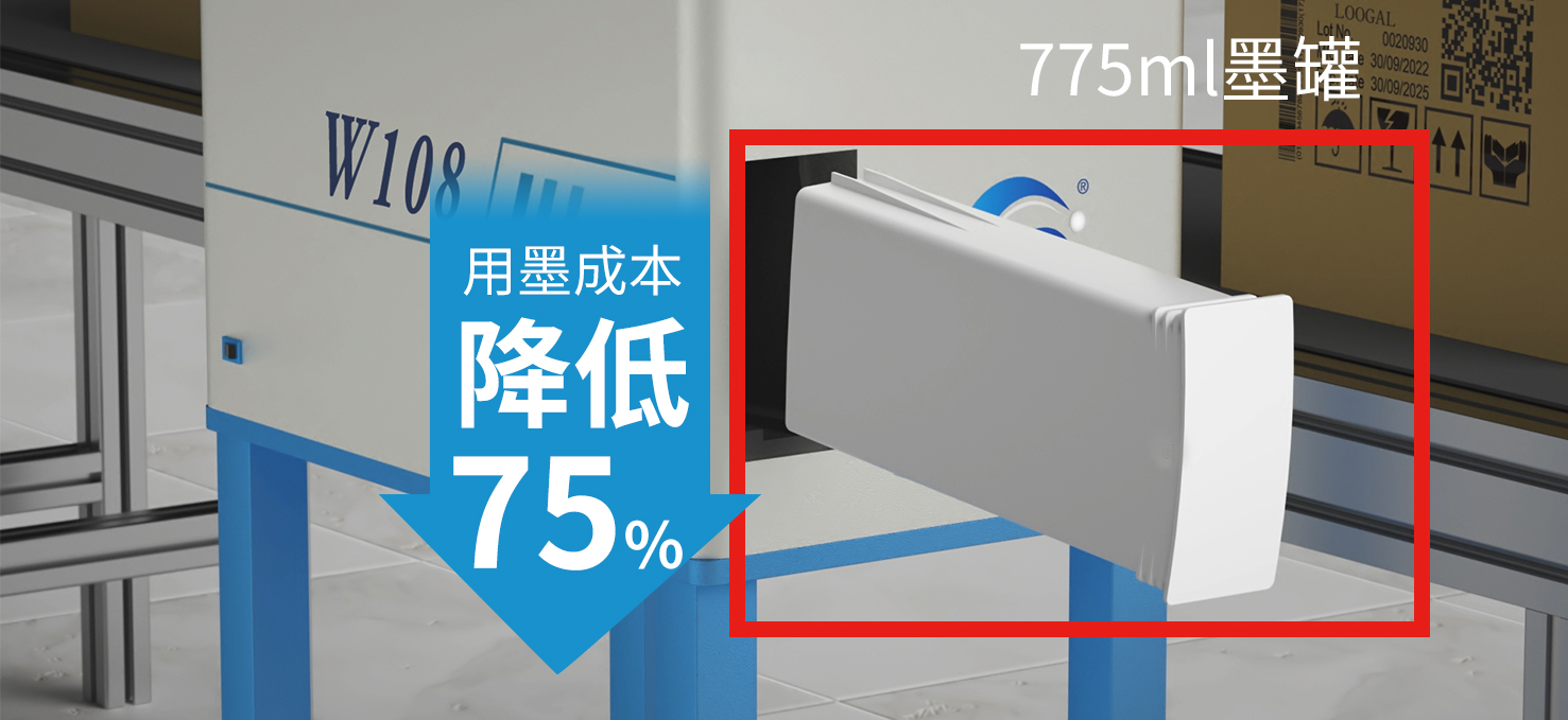 W108噴碼機(jī)配備775ml大墨盒,可以有效降低了用墨成本,幫助用戶實(shí)現(xiàn)成本控制。
